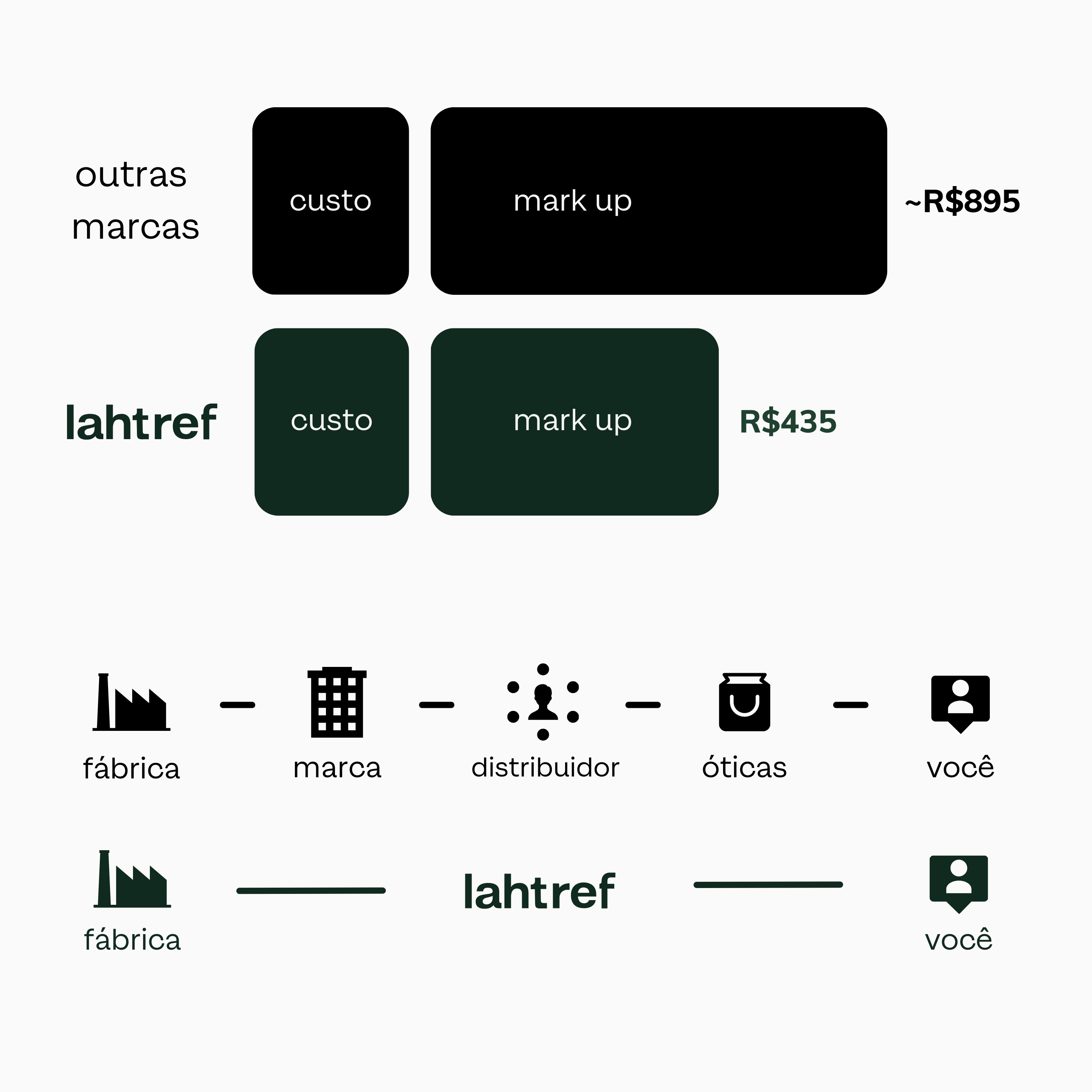 Cada elo dessa cadeia adiciona seu próprio mark up (aumento de preço), fazendo com que o mesmo produto chegue ao consumidor final por quase o dobro do valor. Assim, uma armação que poderia custar em torno de R$435 (nos padrões da Lahtref) passa facilmente a ser vendida por ~R$895 ou mais em outras marcas.